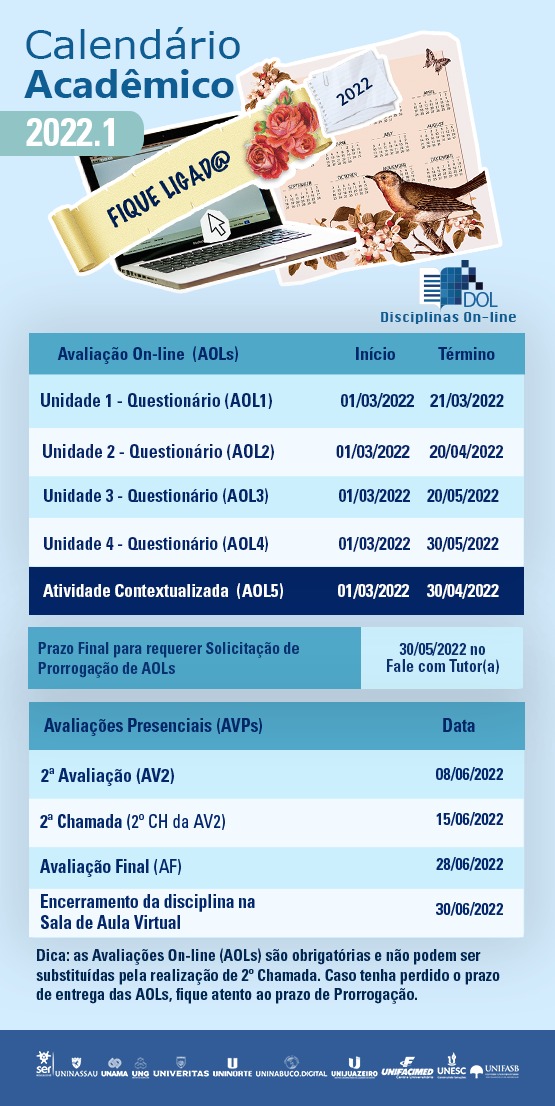 Segue o calendário das ATIVIDADES ONLINE das disciplinas Híbridas.