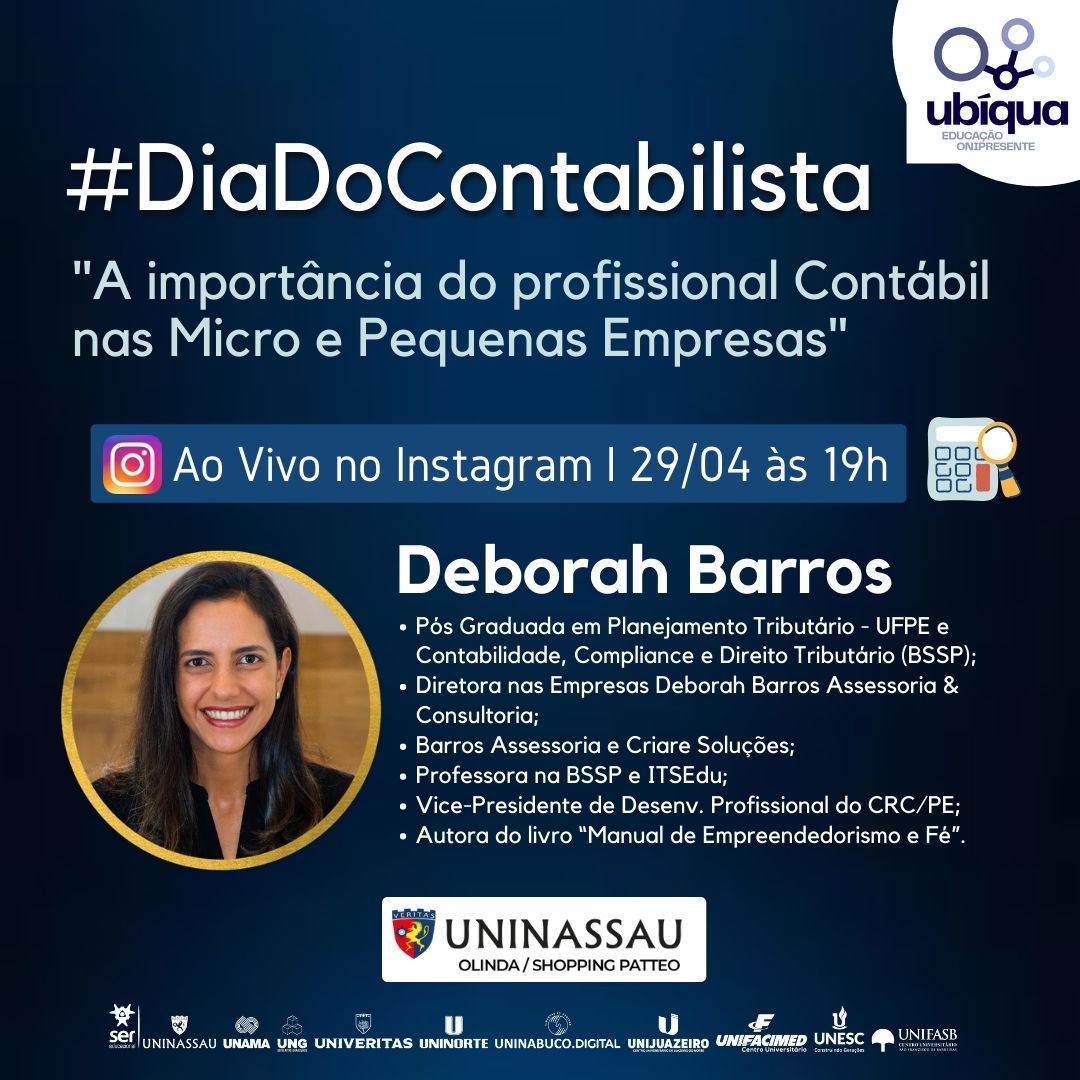 Vamos receber a Vice Presidente do CRC-PE às 19hs no Instagram da Uninassau Olinda para falar sobre " A importância do profissional Contábil nas Micro e Pequenas Empresas.