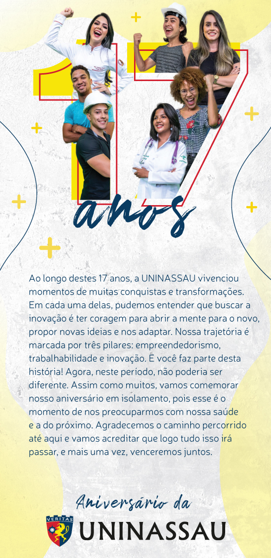 É com muito orgulho que comemoramos os 17 anos da UNINASSAU, fazer parte dessa história nos faz refeltir e ter a certeza que fizemos a diferença na vida de muitas pessoas. Aos nosso alunos nosso muito obrigada por fazer dessa tragetória um marco na sociedade.