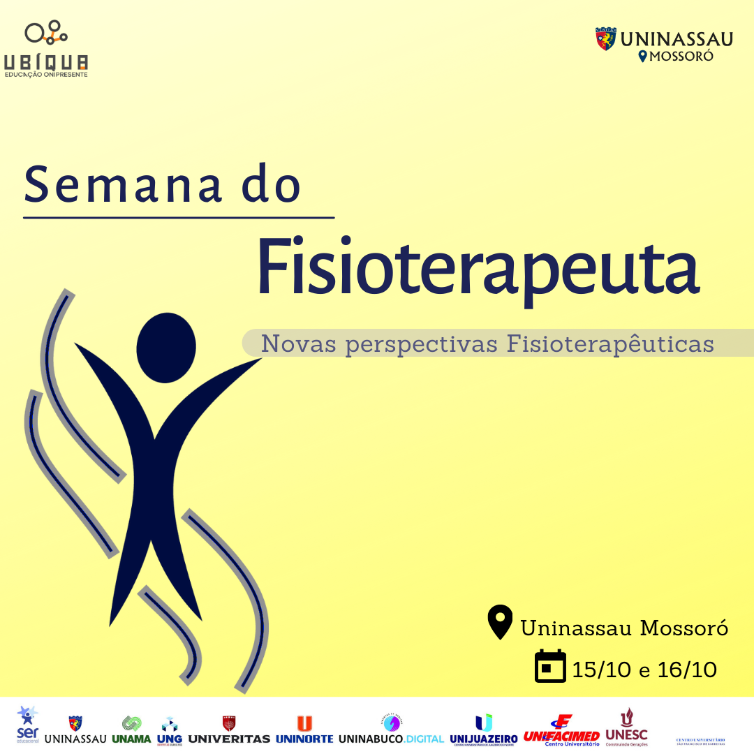 Olá estudante, é com imensa alegria que anunciamos a SEMANA DO FISIOTERAPEUTA 2021. O evento acontecerá nos dias 15/10 e 16/10 na modalidade presencial na Faculdade Uninassau Mossoró. Aguardem e se preparem para um super evento, realizado em comemoração ao dia do Fisioterapeuta que é dia 13 de Outubro. Em breve, mais informações...