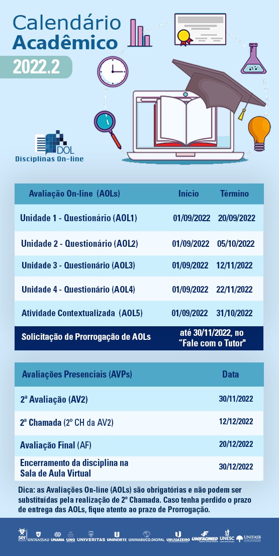 Compartilho calendário acadêmico DOL referente ao período letivo 2022.2.