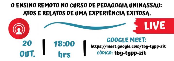 Caros alunos e alunas! No dia 20 de outubro, às 18:00 contaremos com a participação de três alunos do curso de pedagogia, através da plataforma Google Meet. A organizadora da live é a docente da Uninassau Kátia Farias Antero. Uninassau-Paraíba-Campina Grande-Pedagogia.