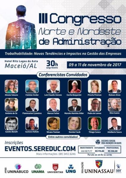 Estão abertas as inscrições para o III Congresso Norte e Nordeste de Administração a ser realizado em Macéio-AL, entre os dias 09 e 11 de novembro de 2017, nas dependências do Hotel Ritz Lagoa da Anta, com 30 h complementares e o tema "Trabalhabilidade: Novas Tendências e Impactos na Gestão das Empresas".