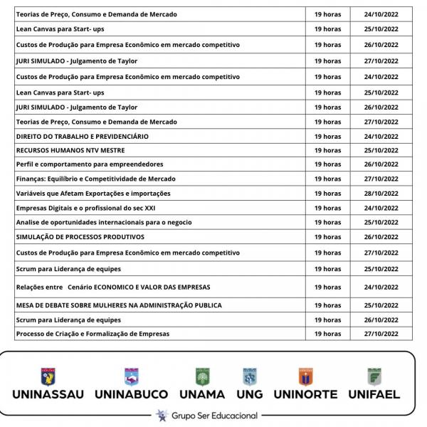 Semestralmente o SER Educacional realiza uma semana de oficinas profissionalizantes com temas contemporâneos e relevantes para consolidar a formação dos graduandos. As atividades são realizadas por especialistas de mercado, mestre e doutores que compartilham conhecimentos e experiências através de mesa redonda, palestras, seminários, fóruns, amostras e vídeos publicados na EIS play para debate e resenhas.