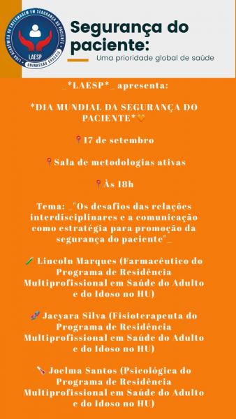 Em comemoração ao dia Mundial de Segurança do paciente, a Liga Acadêmica de Enfermagem em Segurança do Paciente promoveu uma aula aberta, na noite do dia 17 de setembro, com o tema: os desafios das relações interdisciplinares e a comunicação como estratégia para promoção da segurança do paciente. Os palestrantes convidados do evento foram: Lincoln Marques (Farmacêutico do Programa de Residência Multiprofissional em Saúde do Adulto e do Idoso no Hospital Universitário), Jacyara Silva (Fisioterapeuta do Programa de Residência Multiprofissional em Saúde do Adulto e do Idoso no Hospital Universitário) e Joelma Santos (Psicóloga do Programa de Residência Multiprofissional em Saúde do Adulto e do Idoso no Hospital Universitário). O evento foi um sucesso, repleto de discussões enriquecedoras para todos que participaram.