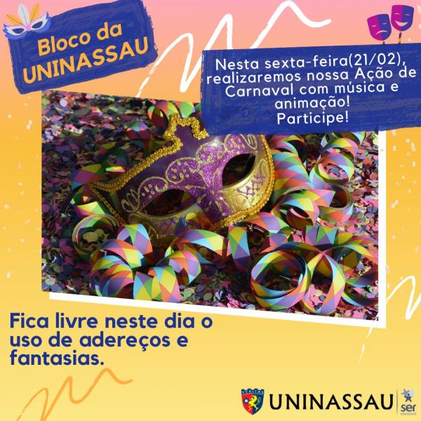 Nesta sexta feira dia 21 fevereiro 2020 fica liberado o uso de algum adereço de carnaval entre colaboradores e professores / alunos . Carnaval com Paz na Sede UNINASSAU Dorotéias/ Fortaleza de acordo com o folder.