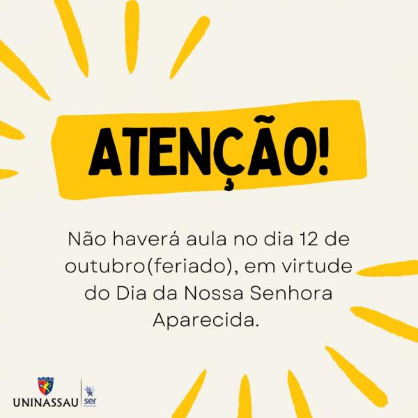 Não haverá aula no dia 12 de outubro, em virtude do feriado do Dia de Nossa Senhora Aparecida.