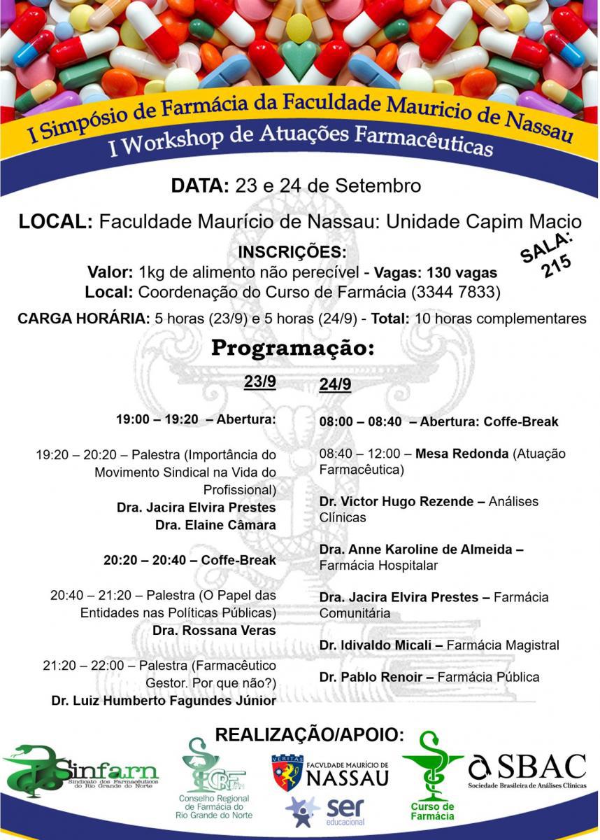 O campus de Capim Macio em Natal sediará o evento que contará também com o I Workshop de Atuações Farmacêuticas, com palestras,e uma mesa redonda com a presença do DR. Victor Hugo que falará sobre análises clínicas, Dra. Anne Karoline de Almeida, que palestrará sobre farmácia hospitalar dentre outros profissionais.