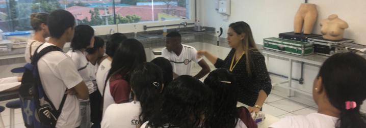 A atividade é parte de um evento de Mostra de profissões em que os alunos isitam laboratórios de cada curso e conversam com profissionais da área sobre suas experiências.